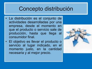 Este documento describe las políticas de distribución en el turismo. Explica que la distribución involucra todas las actividades desde la producción de un producto o servicio hasta que llega al consumidor final. Luego detalla los principales canales de distribución en el turismo como agencias de viajes, tour operadores y sistemas centralizados de reservas. Finalmente, discute cómo la tecnología y el comercio electrónico han afectado a los intermediarios tradicionales en la industria turística.