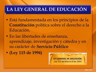 Este documento describe el sistema educativo de Colombia, incluyendo las leyes y políticas que lo rigen, los modelos pedagógicos implementados, y los planes para integrar las TIC en las escuelas. El sistema se compone de educación preescolar, básica, media y universitaria, y sigue las leyes General de Educación y otras normas. Existe un enfoque en mejorar la calidad a través de programas como Computadores para Educar y el plan Vive Digital, con el objetivo de cerrar la brecha digital y mejorar los resultados educativos para 2021