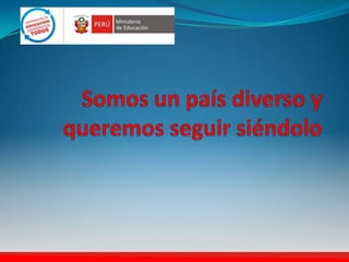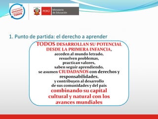 1) El documento describe las políticas educativas priorizadas en Perú para lograr que todos los estudiantes aprendan y superen las brechas de calidad y equidad. 2) Se enfoca en mejorar los aprendizajes, especialmente en comunicación y matemáticas, y cerrar las brechas entre zonas rurales y urbanas. 3) Promueve una educación intercultural crítica y transformadora para valorar la diversidad cultural del Perú.