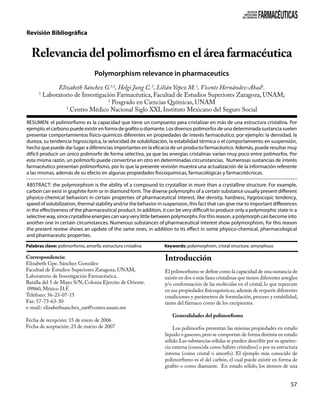 Este documento presenta una revisión bibliográfica sobre la relevancia del polimorfismo en el área farmacéutica. Explica que el polimorfismo es la capacidad de un compuesto para cristalizar en más de una estructura cristalina, lo que puede dar lugar a diferencias en propiedades físicas como la solubilidad. Numerosas sustancias farmacéuticas presentan polimorfismo, como los barbitúricos, sulfonamidas y esteroides. Los diversos polimorfos de un fármaco pueden afectar