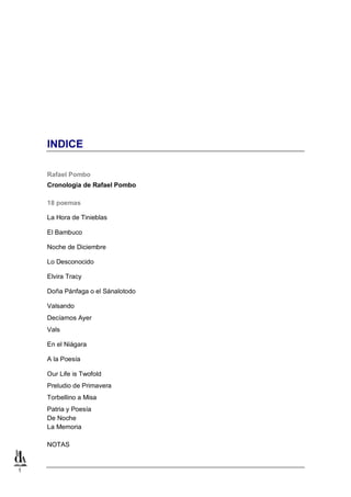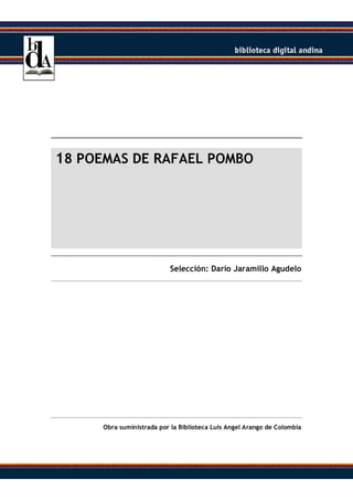 Este documento presenta un resumen biográfico y analítico de la obra poética de Rafael Pombo. En 3 oraciones: Pombo decidió dedicarse a la poesía en 1850 en el contexto del romanticismo que florecía en Colombia. Publicó cerca de 1400 poemas que abarcan una gran variedad de temas y géneros aunque su obra más reconocida es su poesía infantil. A pesar de las diferencias entre el romanticismo y la sensibilidad actual, la poesía de Pombo continúa vigente por la belleza de algunos de sus poemas que