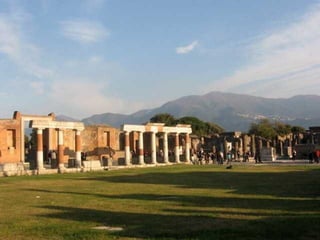 La ciudad romana de Pompeya, ubicada cerca de Nápoles, fue sepultada por la erupción del Vesubio en el año 79 d.C., conservando sus estructuras y objetos. Con una población de unas 20,000 personas, Pompeya contaba con viviendas, tiendas, templos, un anfiteatro, termas y hasta un prostíbulo. Las excavaciones revelan detalles de la vida cotidiana en esta próspera ciudad que fue enterrada repentinamente bajo cenizas volcánicas.