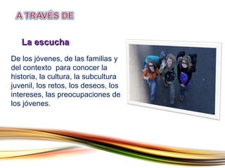El documento describe varias estrategias para comunicar el Evangelio a los jóvenes de manera efectiva, incluyendo escucharlos, estar presente donde ellos se encuentran, acompañarlos personalmente, y utilizar un lenguaje y medios relevantes para ellos. También enfatiza la importancia del testimonio personal coherente y una relación de confianza con los jóvenes.