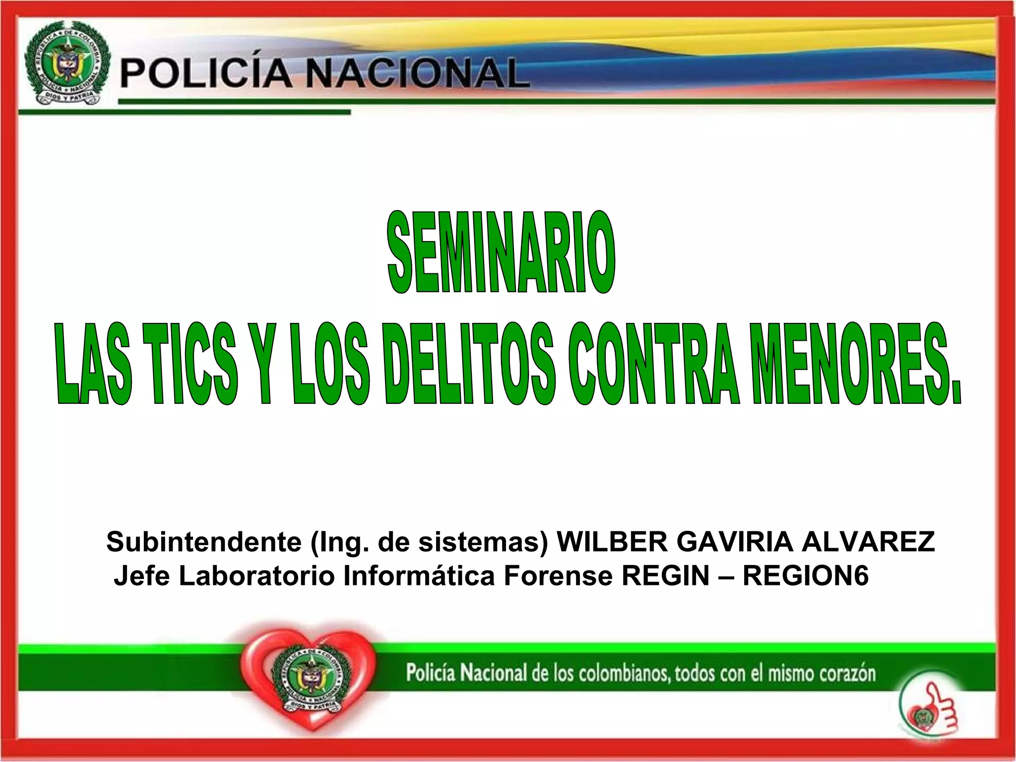 El documento resume diferentes tipos de delitos informáticos contra menores, incluyendo fraude electrónico, phishing, estafas nigerianas, pornografía infantil, ciberacoso y explotación sexual. Describe cómo los delincuentes usan técnicas de ingeniería social para robar información de usuarios y cometer estos crímenes a través de Internet.