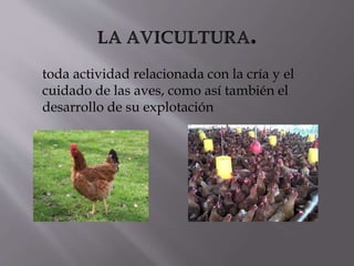 El documento describe los aspectos clave para la construcción y operación de un galpón avícola. Se recomienda construir naves separadas para iniciación, desarrollo y producción, con cimientos sólidos, techo para ventilación, paredes de mampostería y piso elevado con drenaje. También cubre detalles sobre nidos, bebederos, comederos, densidades poblacionales y fases del ciclo productivo de las aves.