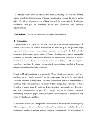 Este documento presenta resultados parciales de una investigación sobre las concepciones de docentes acerca del desarrollo de competencias científicas en estudiantes. Se encontró que los docentes aún usan métodos tradicionales y que las prácticas en el aula dan poco uso a recursos y experimentación. El objetivo es identificar las concepciones docentes sobre la enseñanza de ciencias y caracterizar sus prácticas para desarrollar competencias científicas en los estudiantes.