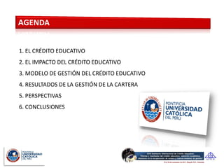 El documento presenta información sobre el crédito educativo en la Pontificia Universidad Católica del Perú. Desde 1967, la universidad ha otorgado préstamos a 4,834 estudiantes. El documento analiza el impacto del crédito educativo en la retención y deserción de estudiantes, así como los resultados de la gestión de la cartera de préstamos. Finalmente, presenta perspectivas sobre el desarrollo de un sistema nacional de crédito educativo en el Perú.