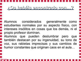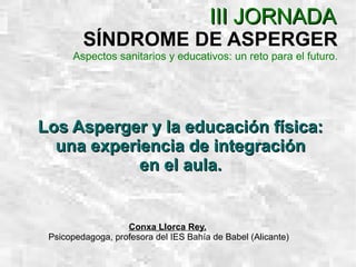 El documento presenta una experiencia de integración de estudiantes con Síndrome de Asperger en el aula de educación física. La autora describe los desafíos que enfrentan estos estudiantes y propone una metodología adaptada con claridad, rutina y consistencia para satisfacer sus necesidades y potenciar sus habilidades.