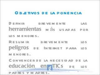 El documento habla sobre la educación de los menores en el uso de las tecnologías. Define las herramientas más usadas por los menores como las redes sociales y su uso para actividades sociales e información. Explica los peligros de internet como contactar con desconocidos o exceso de información personal. Argumenta que los padres deben educarse en estas tecnologías para guiar a los menores en su uso seguro y provechoso.