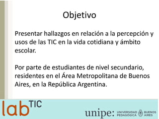 El documento presenta un estudio sobre la percepción y uso de las TIC por estudiantes de secundaria en el área metropolitana de Buenos Aires, destacando su amplio acceso a dispositivos digitales pero señalando una insuficiente alfabetización mediática. Los resultados indican que, aunque los jóvenes utilizan tecnología, esto no garantiza un uso enriquecedor para su formación académica y se evidencian carencias en la integración efectiva de estas herramientas en el ámbito escolar. Se concluye que es fundamental promover prácticas educativas que fomenten la creatividad y capacidad crítica en un contexto digital cambiante.