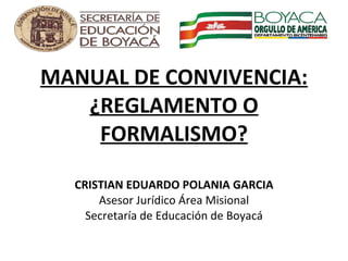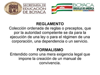 El documento discute el manual de convivencia en las instituciones educativas. Explica que debe contener normas claras sobre los derechos, deberes y procedimientos disciplinarios para estudiantes, docentes y directivos, de acuerdo con la Constitución y leyes como la Ley de Infancia y Adolescencia. También cubre temas como sanciones apropiadas, debido proceso, y la responsabilidad de los directivos de informar correctamente sobre el cumplimiento de las normas.