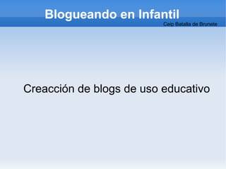Este documento proporciona información sobre cómo crear y usar blogs educativos. Explica qué es un blog y cómo se pueden integrar diferentes tipos de contenido como fotos, videos, documentos y presentaciones. También describe los pasos recomendados para construir un blog en Blogger, incluyendo planear el nombre y contenido, crear una cuenta de Gmail, diseñar el blog e invitar a otros autores.