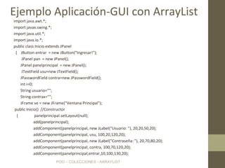 Este documento describe una aplicación de agenda de contactos que utiliza ArrayList para almacenar objetos de tipo Persona. La aplicación tiene una interfaz gráfica que permite ingresar, eliminar y desplegar contactos. Los contactos se almacenan en una colección ArrayList y cada objeto Persona contiene atributos como rut, nombre, dirección, etc. La aplicación valida los datos ingresados y busca contactos existentes antes de guardar uno nuevo.
