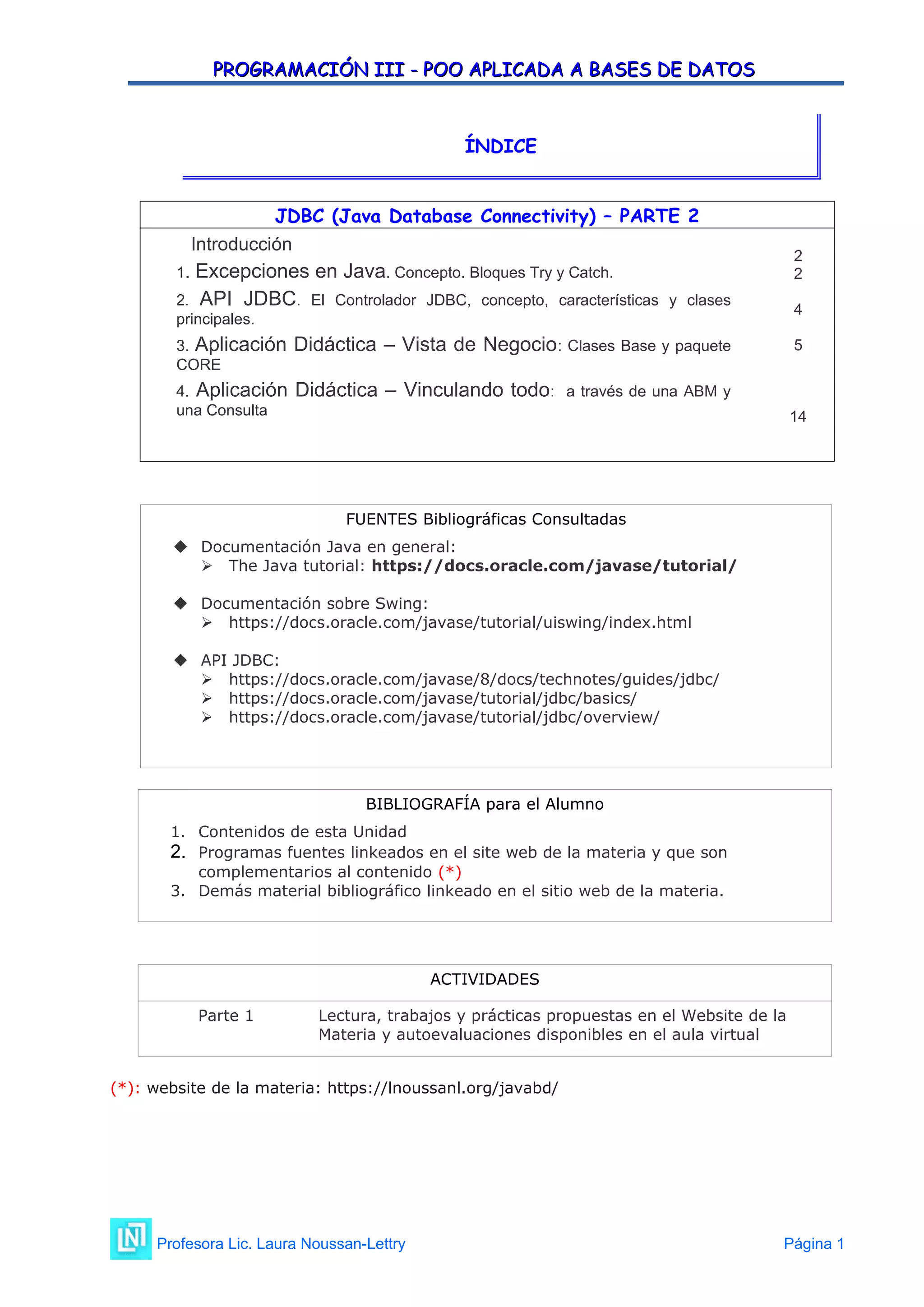 El documento aborda la programación orientada a objetos (POO) aplicada a bases de datos utilizando JDBC, un API que permite la conexión entre Java y diferentes sistemas de gestión de bases de datos. Se discuten conceptos de manejo de excepciones en Java y se presentan las clases básicas y el paquete core que gestionan la comunicación con JDBC. Además, se describe la arquitectura de JDBC y las diferentes categorías de controladores que facilitan el acceso a bases de datos desde aplicaciones Java.