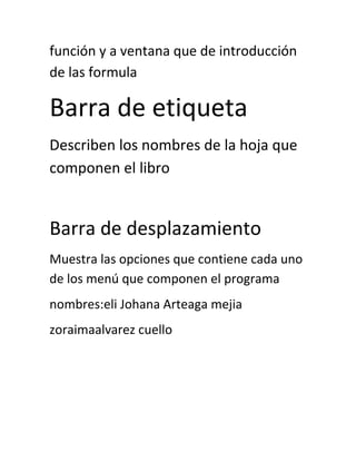 El documento describe las diferentes barras que componen el programa Microsoft Excel 2007, incluyendo la barra de título que muestra el nombre del libro y programa, la barra de fórmula que muestra la celda activa, tipo de función y ventana para introducir fórmulas, la barra de etiqueta que describe los nombres de las hojas del libro, y la barra de desplazamiento que muestra las opciones de cada menú del programa.