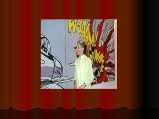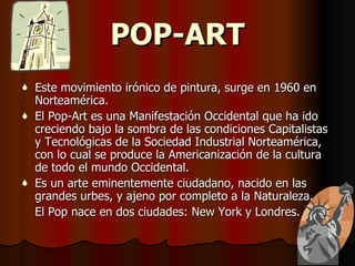 El documento describe el movimiento artístico Pop Art, que surgió en 1960 en Norteamérica. Se centra en temas de la vida cotidiana y la cultura de consumo, utilizando imágenes y estilos tomados de la publicidad, los cómics y la cultura popular. Artistas clave incluyen a Andy Warhol, Roy Lichtenstein y Claes Oldenburg, conocidos por sus versiones ampliadas de imágenes comerciales y objetos de la vida cotidiana.