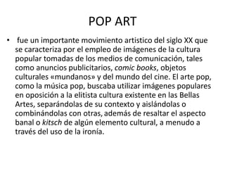 El movimiento artístico Pop Art se caracterizó por emplear imágenes de la cultura popular tomadas de los medios de comunicación como anuncios publicitarios y comics. Algunos de los principales artistas de este movimiento fueron Richard Hamilton, Roy Liechtenstein y Tom Wesselmann. Richard Hamilton fue un pintor británico pionero del Pop Art en el Reino Unido que se basó en motivos y elementos de la cultura popular y de masas. Roy Liechtenstein fue un pintor estadounidense conocido por su interpretación de los cómics mediante ampliaciones de los