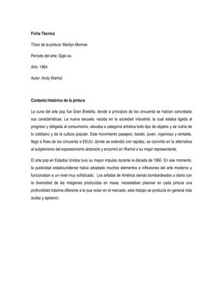 El documento analiza la pintura Marilyn Monroe de Andy Warhol. Pertenece al movimiento Pop Art de los años 1960, cuando se popularizaron las imágenes de la cultura de masas. Warhol retrató a Marilyn Monroe usando serigrafía para replicar su imagen como un producto de consumo, reflejando la sociedad de consumo de la época. El documento analiza el contexto histórico, estilo, técnica y significado de la obra.