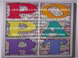 El arte pop se caracteriza por representar objetos de la cultura de masas como latas de sopa, hamburguesas y cómics. Artistas como Andy Warhol, Roy Lichtenstein y Claes Oldenburg usaban imágenes de la publicidad y los medios para criticar la sociedad de consumo de los años 1960. El pop art tomaba elementos de la vida cotidiana y los presentaba como obras de arte para desafiar las nociones tradicionales sobre el arte.