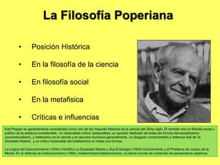 Este documento resume las ideas principales de Karl Popper sobre la filosofía de la ciencia. Popper propuso el falsacionismo, la idea de que una teoría científica debe ser potencialmente falsable a través de observaciones. También desarrolló el concepto del ciclo de conjeturas y refutaciones, donde los científicos generan teorías y luego intentan refutarlas mediante pruebas críticas. Popper creía que la confirmación de una teoría no es posible y que los científicos deben mantener una actitud provision
