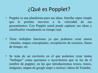 Popplet es una plataforma para organizar ideas visualmente a través de "burbujas" llamadas popplets que permiten agregar texto, imágenes, videos y más. Ofrece funciones como mapas mentales, líneas de tiempo y trabajo colaborativo. Aunque tiene limitaciones como acceso compartido y número de popplets gratuitos, es una herramienta útil para educación al permitir proyectos grupales, presentaciones y diagrama de ideas.