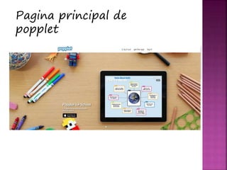 Popplet es una aplicación en la nube que permite crear mapas mentales, conceptuales y otros tipos de gráficos para organizar y estructurar ideas de forma individual o colaborativa. Un popplet consiste en burbujas de información que se pueden conectar entre sí y contener texto, imágenes, dibujos o videos para organizar contenidos. Popplet es una herramienta útil para proyectos escolares desde segundo grado de primaria en adelante, ya que permite compartir y trabajar en equipo de manera sencilla.