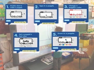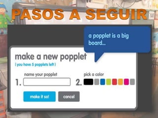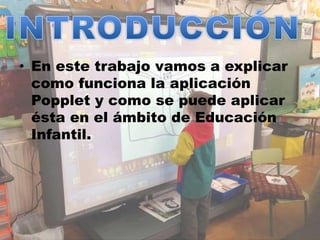 Este documento explica cómo funciona la aplicación Popplet y cómo se puede utilizar en la educación infantil. Popplet permite organizar ideas en forma de gráficos, tiene múltiples funciones para crear resultados atractivos, y puede usarse de manera colaborativa con los estudiantes. Aunque tiene algunas limitaciones como la escritura en español y opciones limitadas para compartir, en general es una herramienta muy útil y práctica para desarrollar las capacidades de los niños.