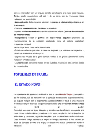 El documento define el populismo como un movimiento político que surgió en América Latina en las décadas de 1930 y 1950 en contra de la oligarquía y los políticos tradicionales. Los movimientos populistas estuvieron liderados por figuras carismáticas que atrajeron el apoyo de los sectores populares con la promesa de reformas. Dos ejemplos fueron el peronismo en Argentina bajo Juan Perón y el Estado Novo en Brasil liderado por Getulio Vargas, que implementaron políticas nacionalistas, de bienestar social y de interven