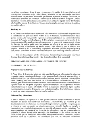 Este documento es la carta encíclica Populorum Progressio del Papa Pablo VI sobre la promoción del desarrollo de los pueblos. Resalta la necesidad de un desarrollo integral que permita a las personas satisfacer sus necesidades básicas y participar plenamente en la sociedad. Señala los desafíos del desequilibrio creciente entre naciones ricas y pobres, y el choque entre civilizaciones tradicionales y modernas. Finalmente, destaca el papel histórico de la Iglesia en promover el progreso