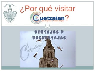 Este documento describe los atractivos turísticos de Cuetzalan, Puebla, México, incluyendo sus atractivos culturales como la indumentaria indígena, artesanía y danzas, y sus atractivos naturales como grutas, ríos y cascadas. También analiza algunas desventajas como la falta de preparación para recibir turistas. El objetivo es mostrar los lugares para visitar en Cuetzalan y discutir algunos inconvenientes.
