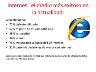 El documento describe cómo la publicidad y el marketing están evolucionando hacia lo digital. Hoy en día, los consumidores pasan más tiempo en internet y basan más sus decisiones de compra en línea. Por lo tanto, es fundamental que las empresas se adapten a esta nueva realidad digital y desarrollen estrategias de marketing efectivas en plataformas como buscadores, redes sociales y correo electrónico.