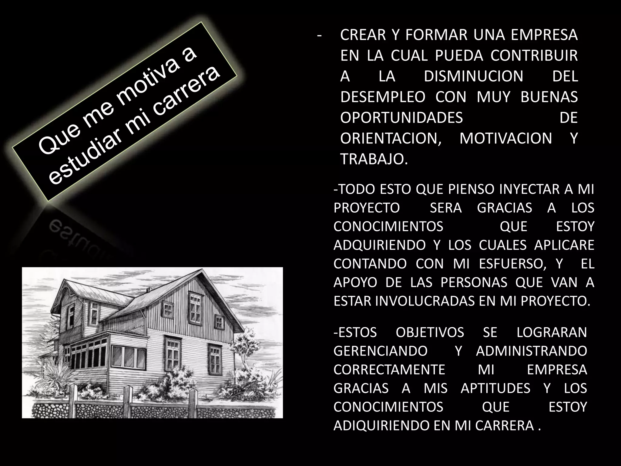 El documento describe los objetivos de crear una empresa para contribuir a reducir el desempleo a través de buenas oportunidades de orientación, motivación y trabajo, aprovechando los conocimientos adquiridos en su carrera y con el apoyo de personas involucradas en el proyecto, y gerenciando la empresa de manera correcta para alcanzar estos objetivos.