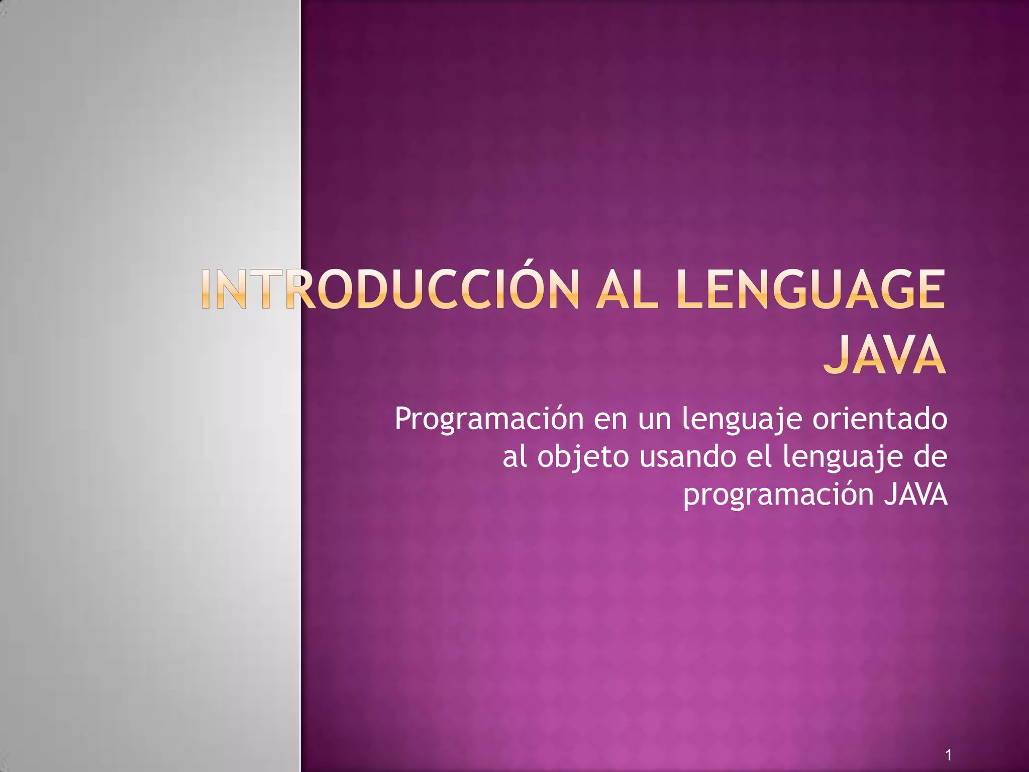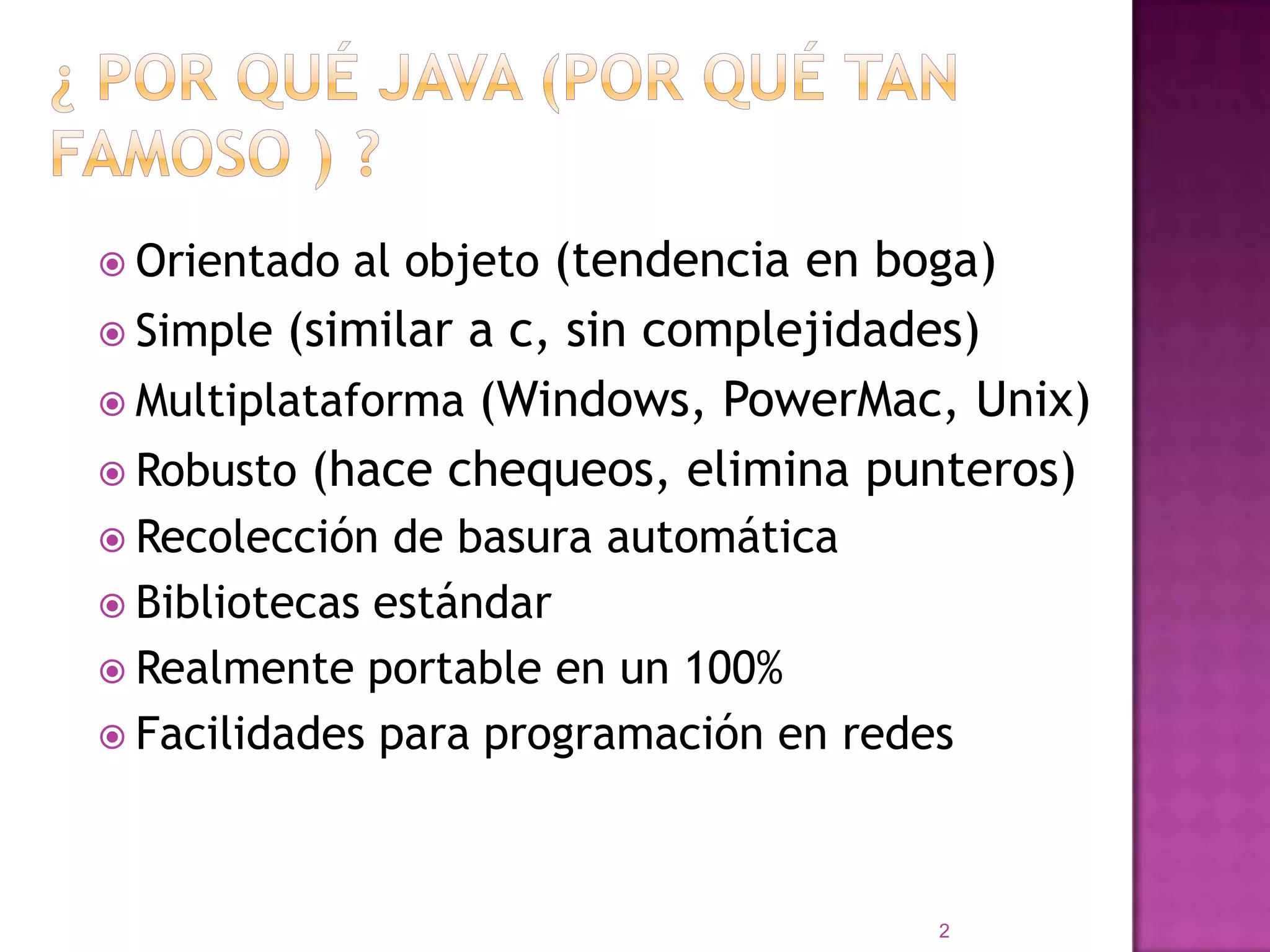 JAVA es un lenguaje orientado a objetos, multiplataforma e interpretado que se compila a código de máquina independiente de la plataforma. Los programas en JAVA se escriben en clases que contienen métodos como main que se ejecutan cuando se invoca el intérprete de JAVA. JAVA soporta tipos de datos primitivos como enteros, reales y caracteres, así como declaraciones, expresiones, instrucciones de control de flujo y conversiones de tipos.