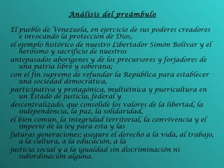 El documento analiza la Ley Orgánica del Ambiente de Venezuela, la cual establece el aprovechamiento sostenible de los recursos naturales y la participación ciudadana en la toma de decisiones sobre el uso de dichos recursos. También analiza la Ley Forestal de Suelos y Aguas, que declara de interés público la conservación, fomento y uso racional de los bosques, suelos y aguas. Finalmente, analiza los artículos 127, 128 y 129 de la Constitución venezolana, los cuales establecen el derecho a un ambiente