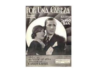 El documento habla sobre el famoso tango "Por una cabeza", escrito por Alfredo Le Pera y Carlos Gardel en 1935. Cuenta la historia de un jugador de apuestas hípica que compara su desventura amorosa con perder una carrera de caballos por una cabeza. El tango ha sido banda sonora de muchas películas y también ha aparecido en la literatura, como en la obra de José Hernández "El gaucho Martín Fierro" y la novela "Boquitas pintadas" de Manuel Puig.