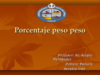El documento explica el concepto de porcentaje peso/peso y cómo calcularlo. El porcentaje peso/peso se refiere a la masa de soluto presente en 100 gramos de solución total y se calcula como el cociente entre la masa de soluto y la masa total de la solución multiplicado por 100. Se proveen ejemplos de cálculos con diferentes masas de soluto y disolvente.