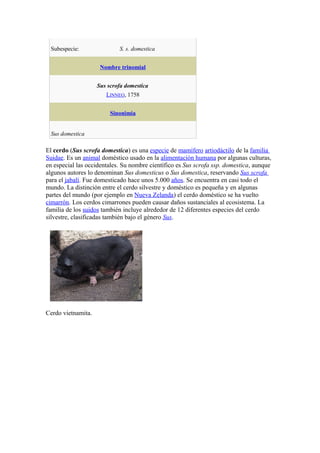 El documento proporciona información sobre el cerdo doméstico (Sus scrofa domestica). Explica que fue domesticado hace unos 5,000 años y se cría en casi todo el mundo para su carne y otros productos. Describe las características físicas y de comportamiento del cerdo, así como las principales razas y enfermedades. También cubre temas como la cría de cerdos, denominaciones populares, productos elaborados y distribución geográfica.