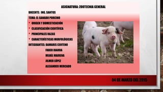 El documento aborda la zootecnia del ganado porcino, incluyendo su origen, domesticación, clasificación científica, razas principales y características morfológicas. Los cerdos, animales omnívoros de la familia Suidae, presentan diversas razas adaptadas a la producción de carne, cada una con características específicas. Además, se detalla el manejo reproductivo y el cuidado necesario durante la gestación y el parto.