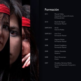 Este documento presenta la información personal y profesional de Josefina Güiraldes. Incluye detalles como su edad, contacto y formación teatral con diferentes directores entre 2007-2011. También lista sus créditos teatrales como actriz extra en obras representadas entre 2009-2010.