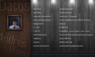 El documento presenta los antecedentes académicos y experiencia del individuo. Completó sus estudios primarios y secundarios en colegios salesianos y obtuvo un título en administración de negocios. Actualmente cursa el tercer semestre de diseño gráfico en la universidad. Ha tomado varios cursos de edición de video, audio, diseño y animación 3D. Asistió a conferencias de diseño en Paraguay y Argentina. Domina varios programas de diseño, edición y software. Tiene experiencia en el manejo de equipos de audio,