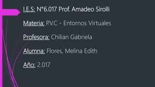 Este documento presenta el portafolio de trabajos realizados en entornos virtuales por Melina Flores para su materia PVC. Incluye resúmenes de 6 actividades realizadas utilizando herramientas como Cmap Tools, Padlet, SlideShare, Prezi, un blog y una webquest. Melina concluye que trabajar con entornos virtuales le permitió incluirse en un mundo global en evolución y que estas herramientas serán útiles para alfabetizar digitalmente a sus futuros alumnos y permitirles construir aprendizajes colabor