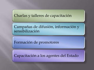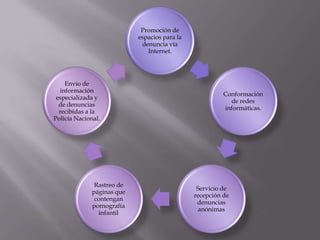 La pornografía infantil se define como cualquier representación de menores en conductas sexualmente explícitas y ha crecido, especialmente en internet. La Red Peruana Contra la Pornografía Infantil trabaja en la erradicación de este delito mediante acciones preventivas, lucha frente a grupos delincuenciales y protección de las víctimas. Este fenómeno tiene un profundo impacto negativo en la salud psicológica y física de los niños afectados.