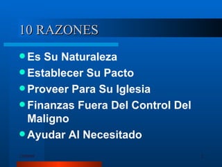 El documento lista 10 razones por las cuales Dios necesita prosperar a sus hijos. Estas incluyen que es la naturaleza de Dios establecer un pacto y proveer para su iglesia, mantener las finanzas de sus hijos fuera del control del maligno, permitir que puedan ayudar a los necesitados, honrar y glorificar a Dios, dejar una herencia para las generaciones futuras, probar la sinceridad de su amor por Dios, ser influyentes para el Reino de Dios, y porque Dios ama a sus hijos.