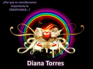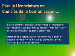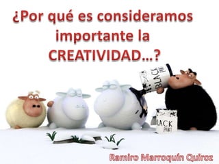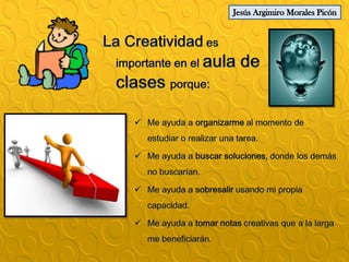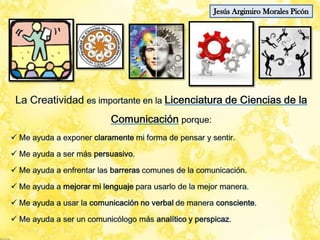 El documento discute la importancia de la creatividad en las ciencias de la comunicación, la vida diaria y el aula de clases. En las ciencias de la comunicación, la creatividad es importante para comunicarse con otros de manera original y distinguirse. En la vida diaria, usamos la creatividad para resolver problemas y darle variedad a nuestras actividades. En el aula, la creatividad se usa para expresarse y aprender de los demás.