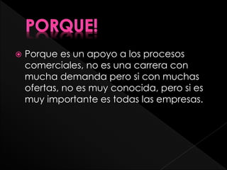 La carrera de logística y cadena de suministro es importante para el apoyo de procesos comerciales en las empresas, aunque no es muy conocida. Esta carrera ofrece varias opciones de empleo como jefe de distribución, jefe de operaciones logísticas, coordinador o supervisor. También permite homologar materias haciendo una maestría en administración de empresas u otra carrera profesional.