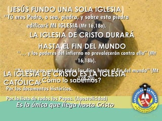 La Iglesia Católica es la única Iglesia fundada por Jesucristo, que durará hasta el fin del mundo. Aunque en la Iglesia hay buenos y malos, es la única que se remonta directamente a Cristo a través de los Papas. Las demás denominaciones religiosas son más recientes y no fueron fundadas por Cristo.