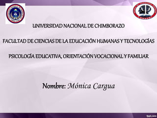 Este documento presenta información sobre una persona llamada Mónica Cargua que está estudiando en la Facultad de Ciencias de la Educación Humanas y Tecnologías, especializándose en Psicología Educativa, Orientación Vocacional y Familiar en la Universidad Nacional de Chimborazo.