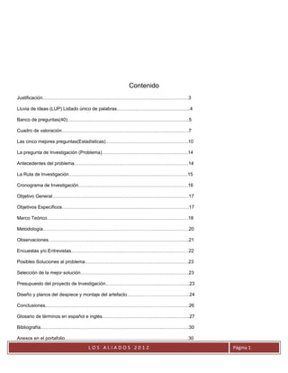 Este documento presenta la información sobre un proyecto de investigación realizado por un grupo de estudiantes del grado noveno sobre la construcción de un robot para realizar tareas domésticas. Incluye la lista de integrantes del grupo, la justificación, objetivos, metodología y cronograma del proyecto. El problema central que aborda es cómo elaborar estrategias para que el municipio de Marinilla tenga un avance tecnológico mediante la construcción de un robot para tareas domésticas.