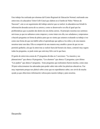 Este documento presenta un resumen de 3 oraciones de una entrevista realizada a la maestra Telmi Colli Canul del Jardín de Niños “Héroes de Nacozari”. Las estudiantes le hicieron preguntas sobre sus prácticas educativas, planeación de clases, relación con los estudiantes y padres. La maestra demostró estar bien preparada y enfocarse en desarrollar la autonomía de los estudiantes a través de actividades prácticas y juegos de aprendizaje. Mantiene una buena comunicación