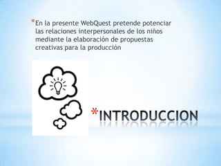 Este documento propone la creación de un juego nuevo que promueva las relaciones interpersonales y los valores positivos entre los niños. El juego se basaría en las características de juegos tradicionales y populares, y tendría reglas diseñadas para fomentar la autoestima de los jugadores. El objetivo final es mejorar las habilidades sociales y personales de los niños a través de un enfoque lúdico y creativo.